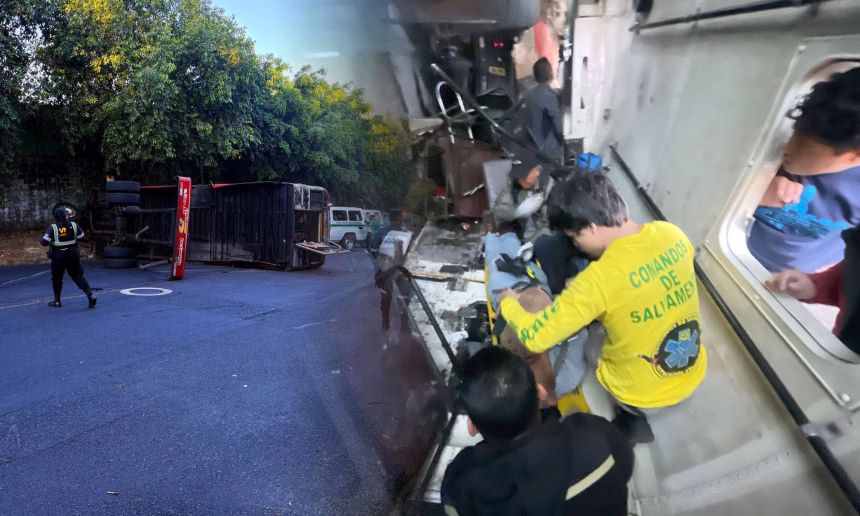 Al menos una veintena de pasajeros resultaron lesionados luego de que un autobús de la ruta 5 volcara la mañana de este miércoles en San Salvador.