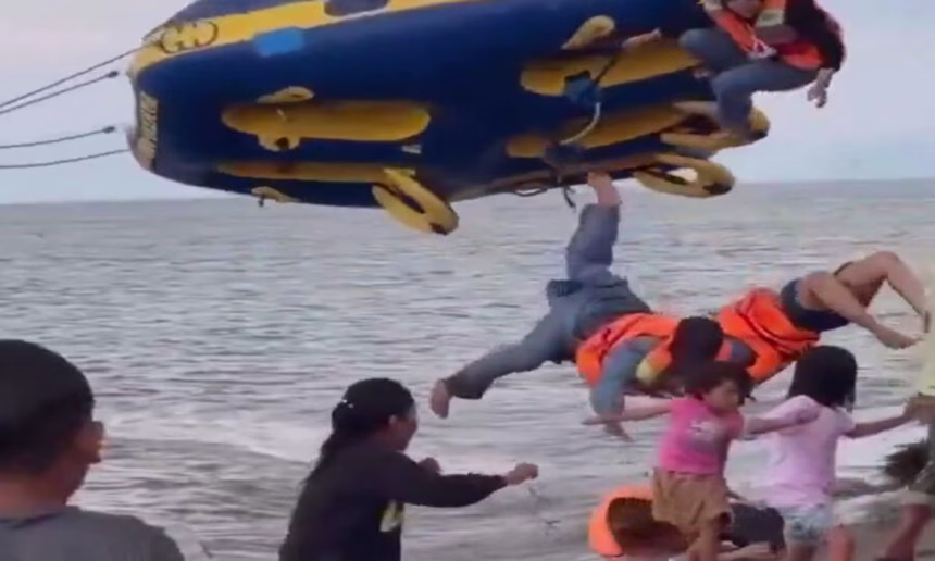 El hecho tuvo lugar en la playa Pantai Harapan Ammani, en Pinrang, donde una embarcación recreativa que remolcaba el inflable se aproximó a gran velocidad y demasiado cerca de la costa, provocando el percance.