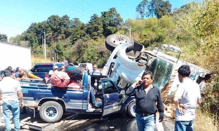 El percance ocurrió en el kilómetro 33 de la carretera a El Salvador, en el sector conocido como “El Chilero”, jurisdicción de Villa Canales. En el lugar, un camión volcó tras colisionar con un vehículo tipo pick up, quedando ambos sobre la vía.