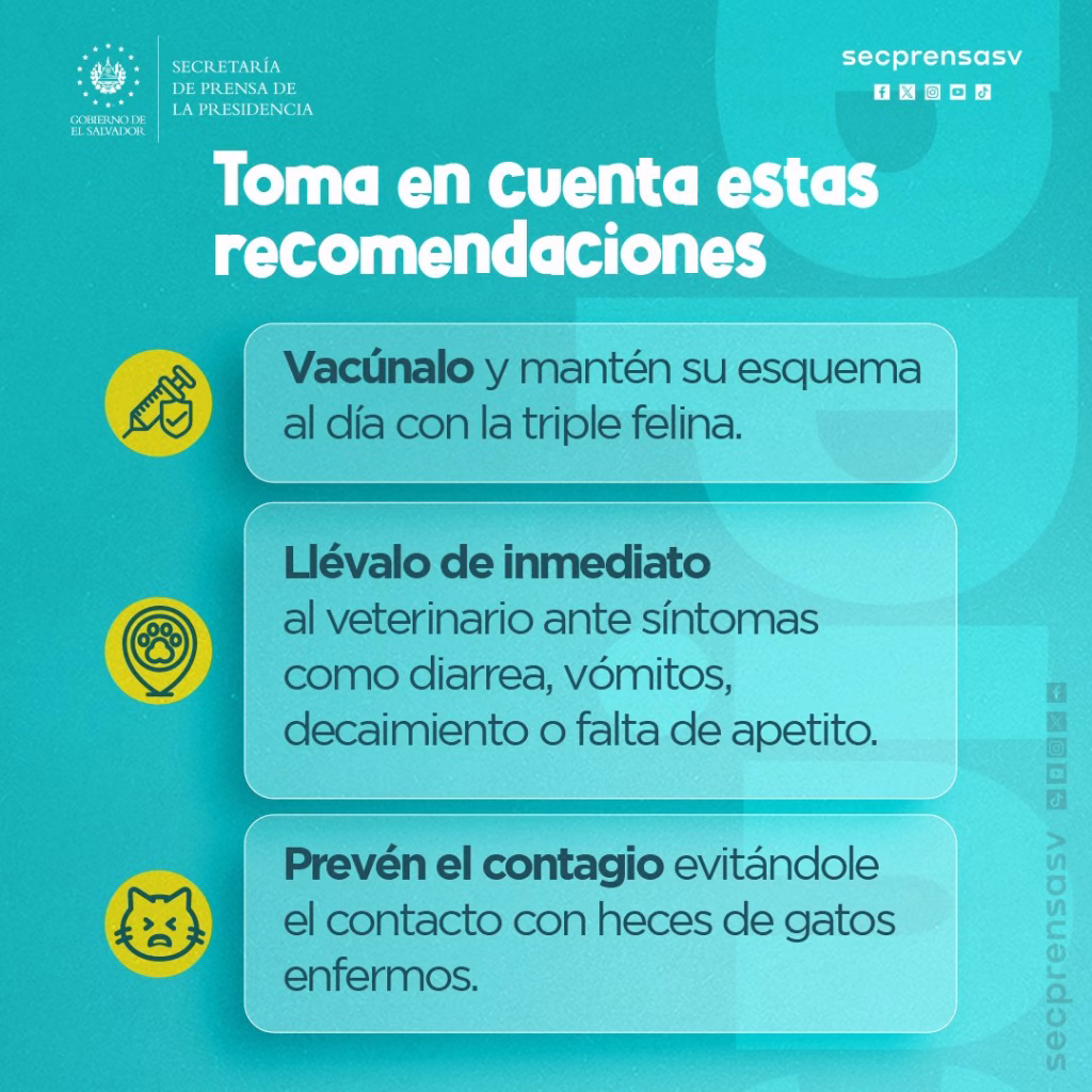 Asimismo, hizo un llamado a las familias que tienen gatos como mascotas a seguir una serie de recomendaciones para reducir el riesgo de contagio y proteger la salud de sus animales. Entre las principales medidas se encuentra mantener actualizado el esquema de vacunación, en particular la Triple Felina, acudir de inmediato al veterinario ante cualquier signo sospechoso y evitar el contacto con otros felinos que puedan estar enfermos.