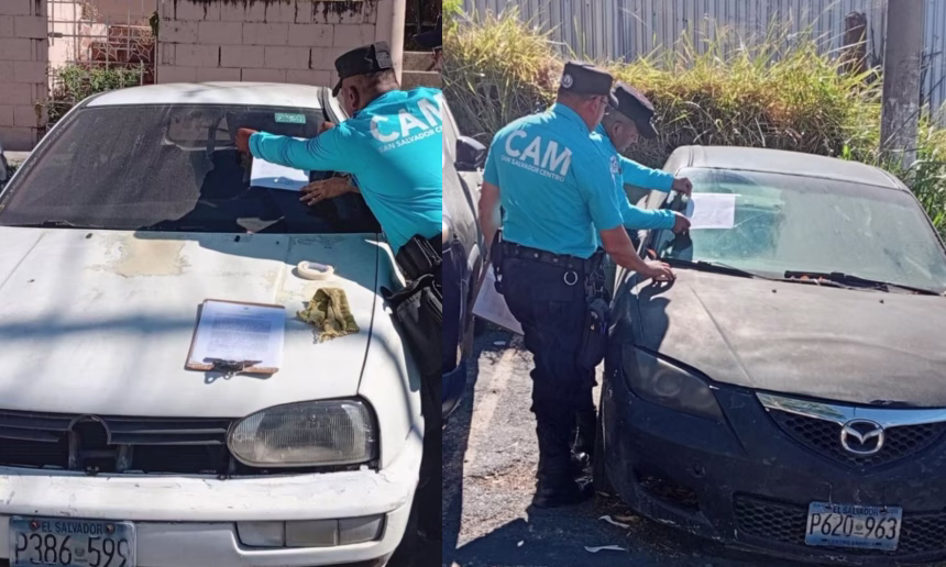 Agentes del Cuerpo de Agentes Metropolitanos de San Salvador llevaron a cabo un operativo para notificar a los propietarios de tres vehículos que se encontraban en estado de abandono en varias zonas de San Salvador.