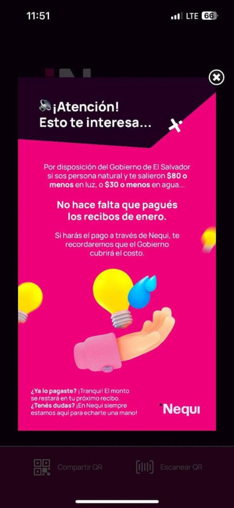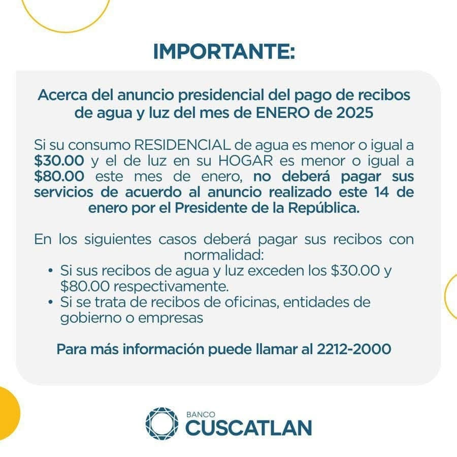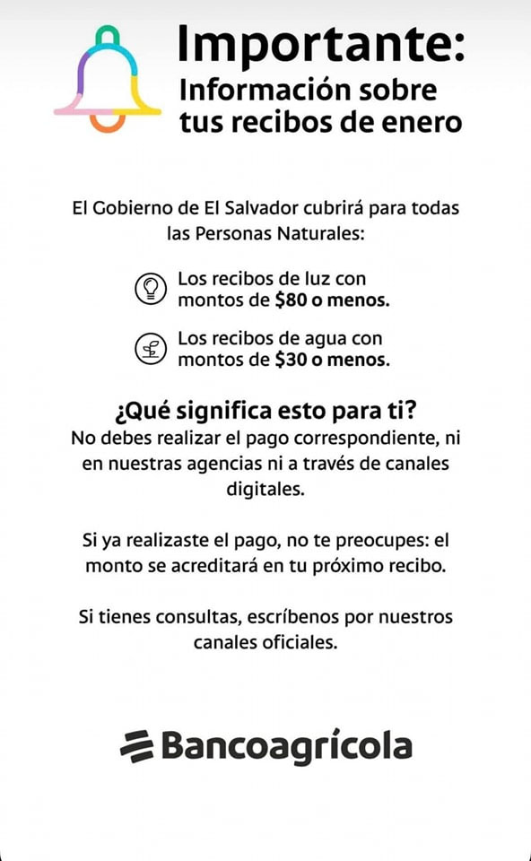El aviso obedece a la medida de alivio económico anunciada por el Presidente Nayib Bukele, ya que su gobierno absorberá dichos costos.