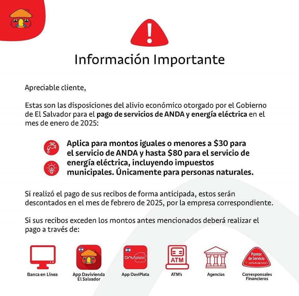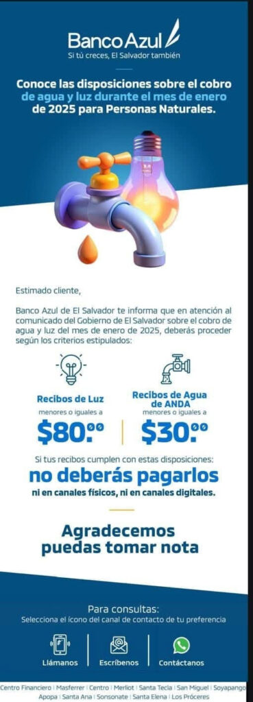 Los diferentes bancos del sistema financiero salvadoreño comenzaron a avisar a sus usuarios que no es necesario que paguen sus facturas de ANDA y de energía eléctrica.