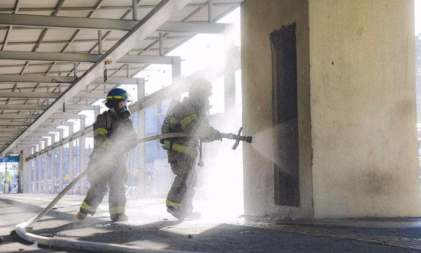 Personal del Cuerpo de Bomberos de El Salvador atendió un principio de incendio dentro de una cabina ubicada en la estación SITRAMSS del Parque Infantil, sobre la Alameda Juan Pablo II, en San Salvador Centro.