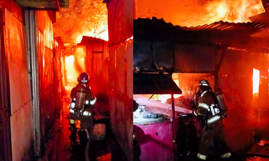 Elementos del Cuerpo de Bomberos de El Salvador se encuentran atendiendo un incendio registrado en varios puestos de venta ubicados en el parque Menéndez, en el centro de Santa Ana.