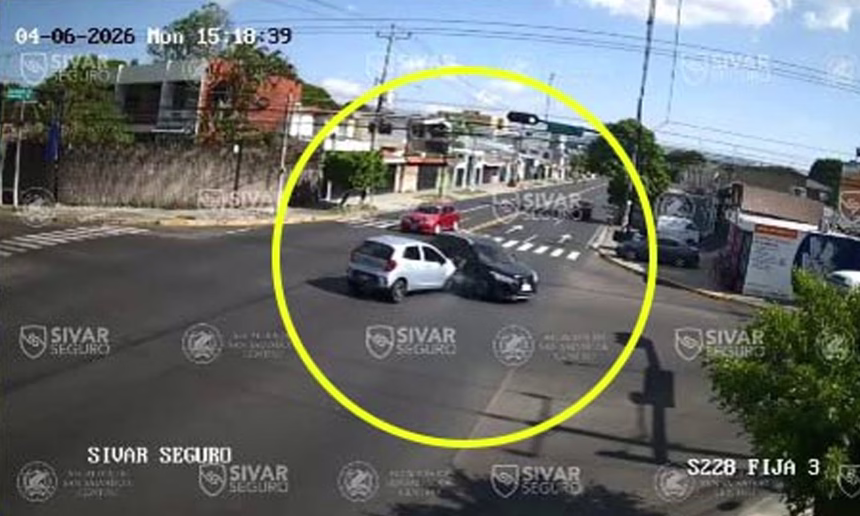El sistema de videovigilancia de la alcaldía de San Salvador captó nuevamente un accidente de tránsito ocurrido por el incumplimiento de las normas viales, en el que se vieron involucrados un vehículo tipo sedán y una camioneta.