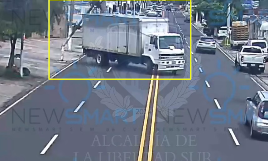 El sistema de videovigilancia de la alcaldía de Santa Tecla captó el momento en que, la maniobra imprudente del conductor de un camión, provocó la caída de un poste de fibra óptica.