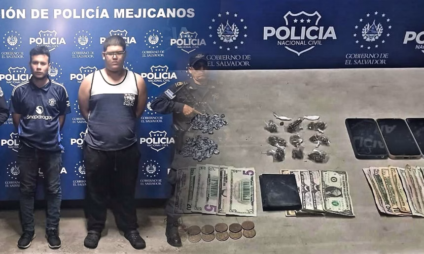 Según el informe policial, los detenidos fueron identificados como José Rafael Cruz Mejía, de 18 años, y Steven Eduardo Viches Alemán, de 27. Durante el operativo, las autoridades les incautaron varias porciones de marihuana, cocaína y metanfetamina.