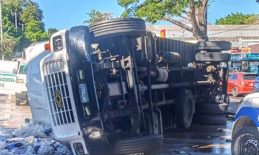 En redes sociales comenzó a circular un video que muestra el momento preciso en que un camión repartidor de sodas sufrió un aparatoso vuelco sobre la carretera que conduce al Puerto de La Libertad, a la altura de San José Villa Nueva.
