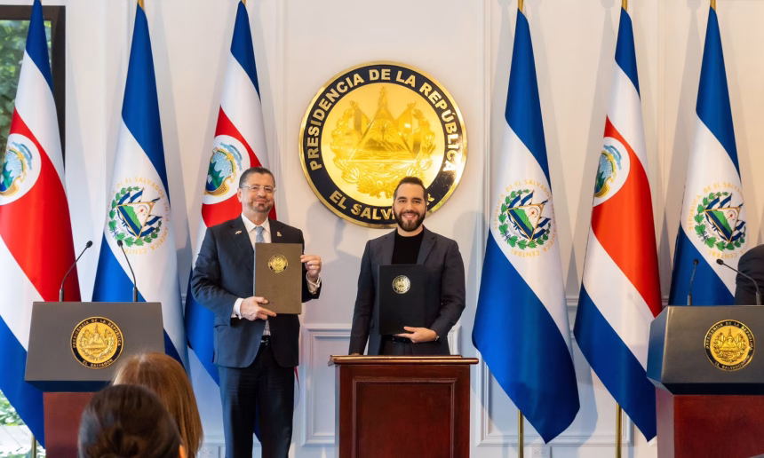 Durante la visita oficial del presidente costarricense Rodrigo Chaves a El Salvador, ambos mandatarios —junto al presidente Nayib Bukele, la canciller Alexandra Hill Tinoco y su homólogo Arnoldo André Tinoco— suscribieron el acuerdo denominado “Escudo de las Américas”, considerado un paso histórico en la relación bilateral.