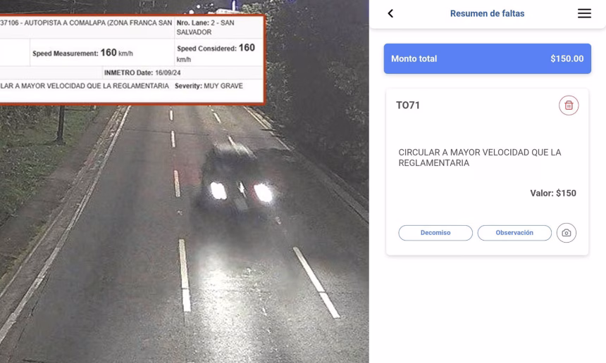 El Viceministerio de Transporte (VMT) reportó que uno de sus sistemas de fotomultas, ubicado en la autopista a Comalapa, registró a un conductor manejando muy por encima del límite permitido.