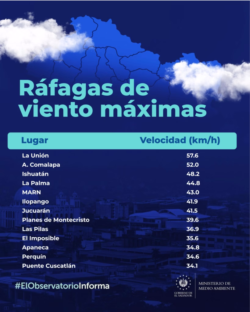 Según el informe oficial, en las últimas horas las ráfagas alcanzaron hasta 57.6 km/h en esa zona del oriente del país. Asimismo, la autopista a Comalapa también presentó vientos fuertes, con registros de hasta 52 km/h.