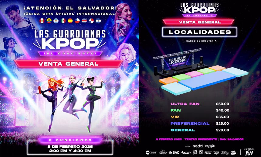 Las Guardianas KPOP se presentarán por primera vez en El Salvador como parte de su gira por Latinoamérica, ofreciendo un espectáculo pensado para el disfrute de toda la familia e inspirado en el fenómeno mundial del K-pop. Cosmo Producciones y Fun Capital anunciaron oficialmente el inicio de la venta general de entradas para este esperado evento.