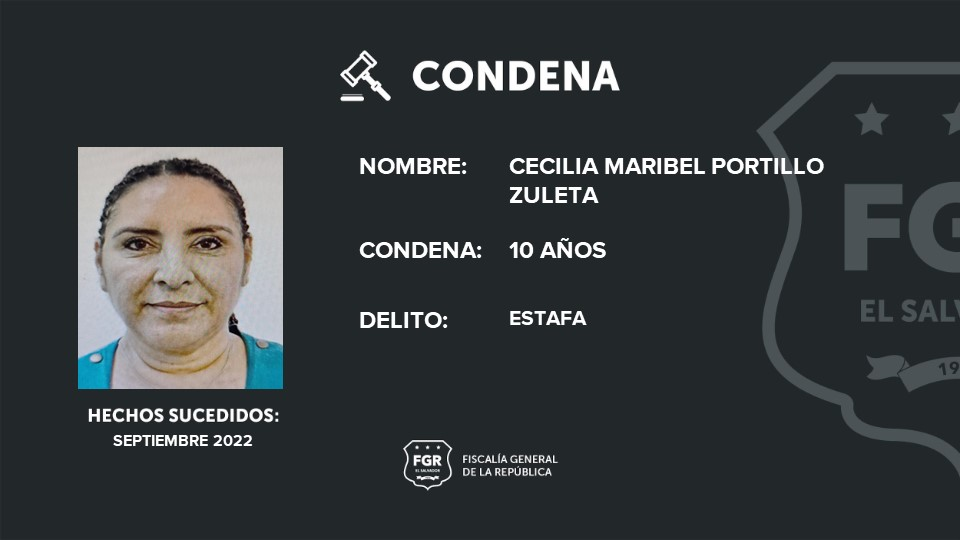 La Fiscalía General de la República (FGR) informa que una mujer identificada como Cecilia Maribel Portillo Zuleta, recibió una condena de 10 años en prisión por el delito de estafa.