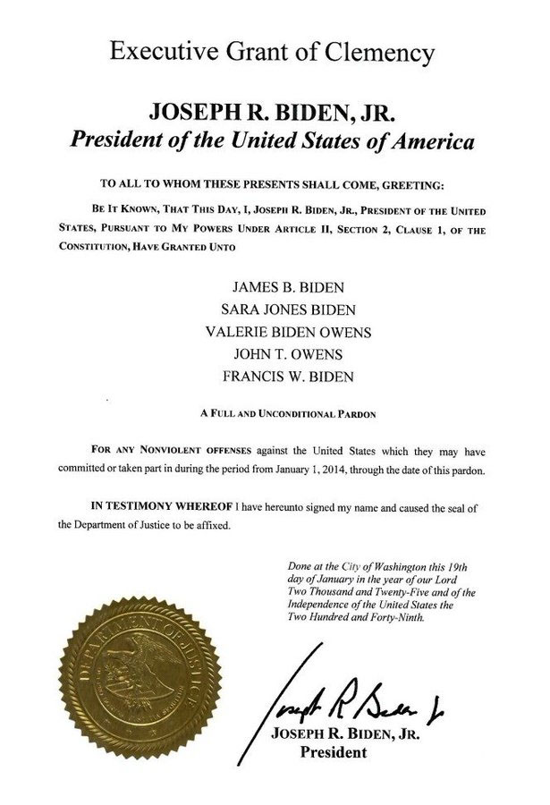 Los beneficiarios de dicho perdón presidencial son James B. Biden, Sara Jones Biden, Valerie Biden Owens, John T. Owens y Francis W. Biden.