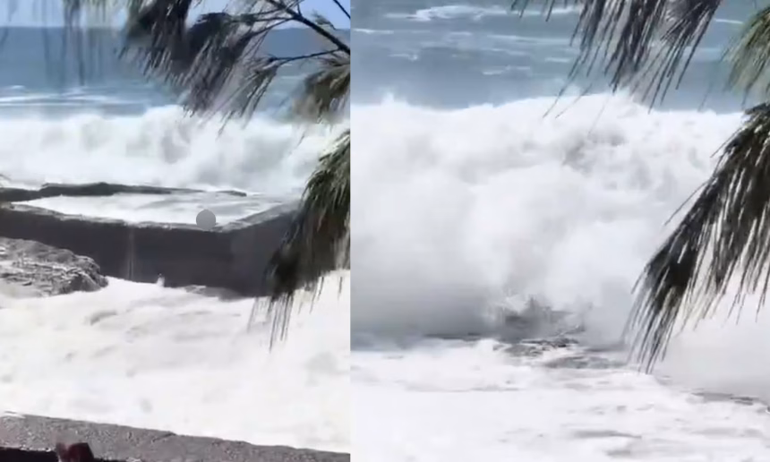 En el video se observa a un joven en una piscina salada mientras el fenómeno conocido como “mar de fondo” provoca un fuerte oleaje que azota la costa.