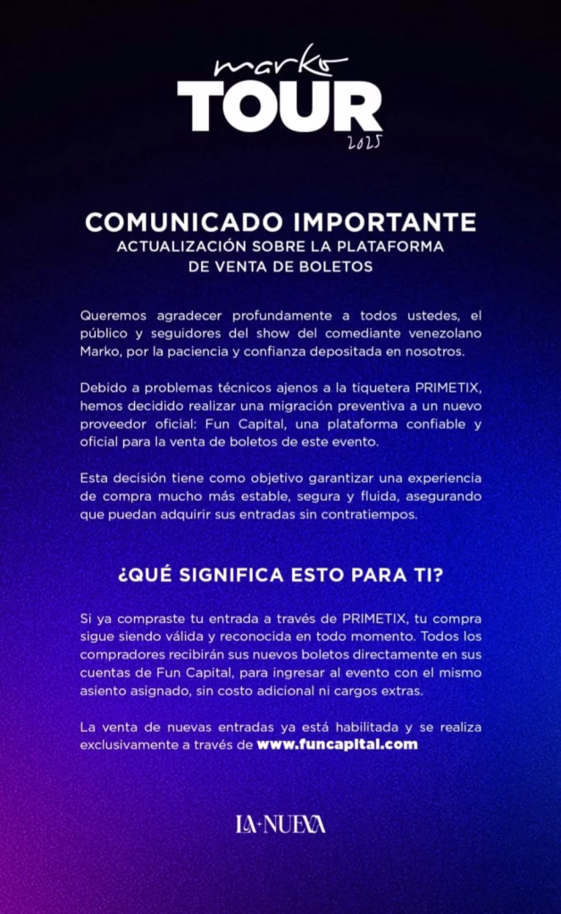 La Nueva Latam, también informó que, debido a problemas ajenos a la tiquetera PRIMETIX, encargada de la venta de entradas, decidieron migrar a otro proveedor oficial: Fun Capital, (https://funcapital.com/). Además, detallaron que las personas que ya habían adquirido sus entradas por medio de PRIMETIX, no tienen que preocuparse de nada, ya que sus boletos son totalmente válidos.