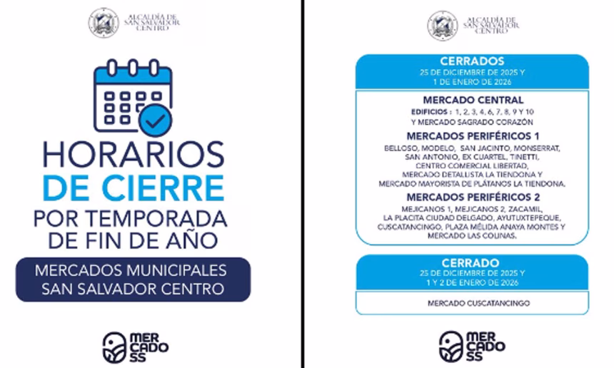 Según la información compartida por la comuna, los mercados permanecerán cerrados únicamente los días 25 de diciembre y 1 de enero de 2026. No obstante, se indicó que el mercado del distrito de Cuscatancingo también suspenderá labores el próximo 2 de enero.