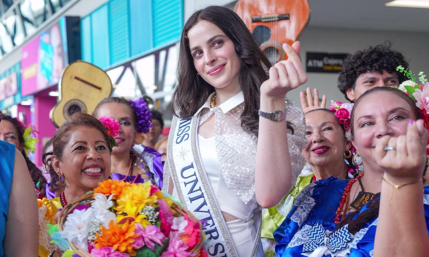 Fátima Bosch, actual Miss Universo 2025, arribó al país y fue recibida en medio de un ambiente festivo, con música, danzas tradicionales y muestras de alegría por parte de los asistentes.