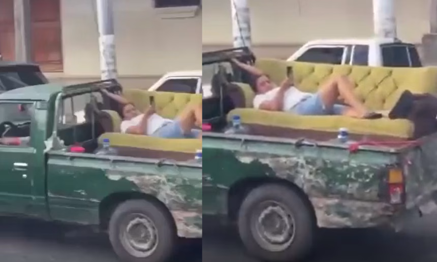 Una escena insólita captada en Chalatenango Sur se volvió viral luego de mostrar a una mujer viajando tranquilamente sobre un sillón colocado en la parte trasera de un pick up.