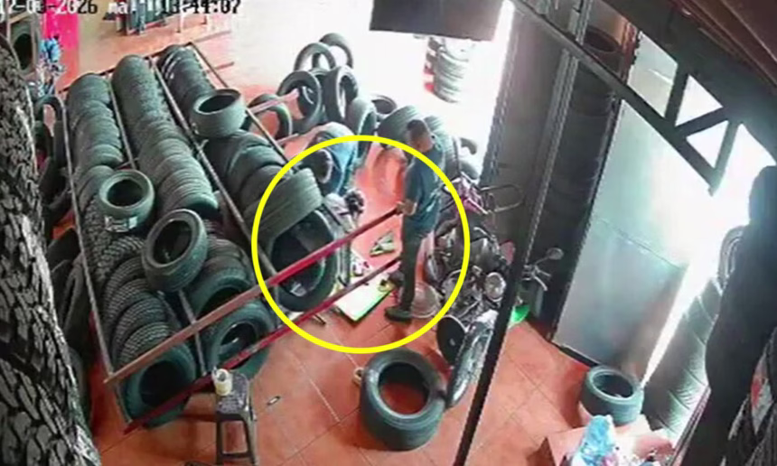 Un impactante accidente laboral quedó captado en video cuando un estante cargado con llantas colapsó repentinamente y cayó sobre una mujer que se encontraba en el lugar.