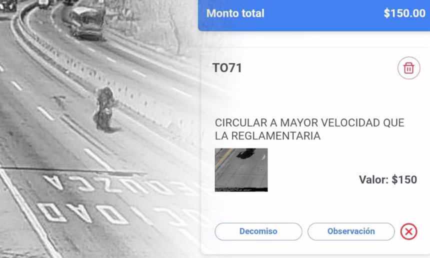 Debido a esta infracción, el motociclista recibió una multa de $150, correspondiente a la falta TO 71, por manejar a una velocidad mayor a la establecida.