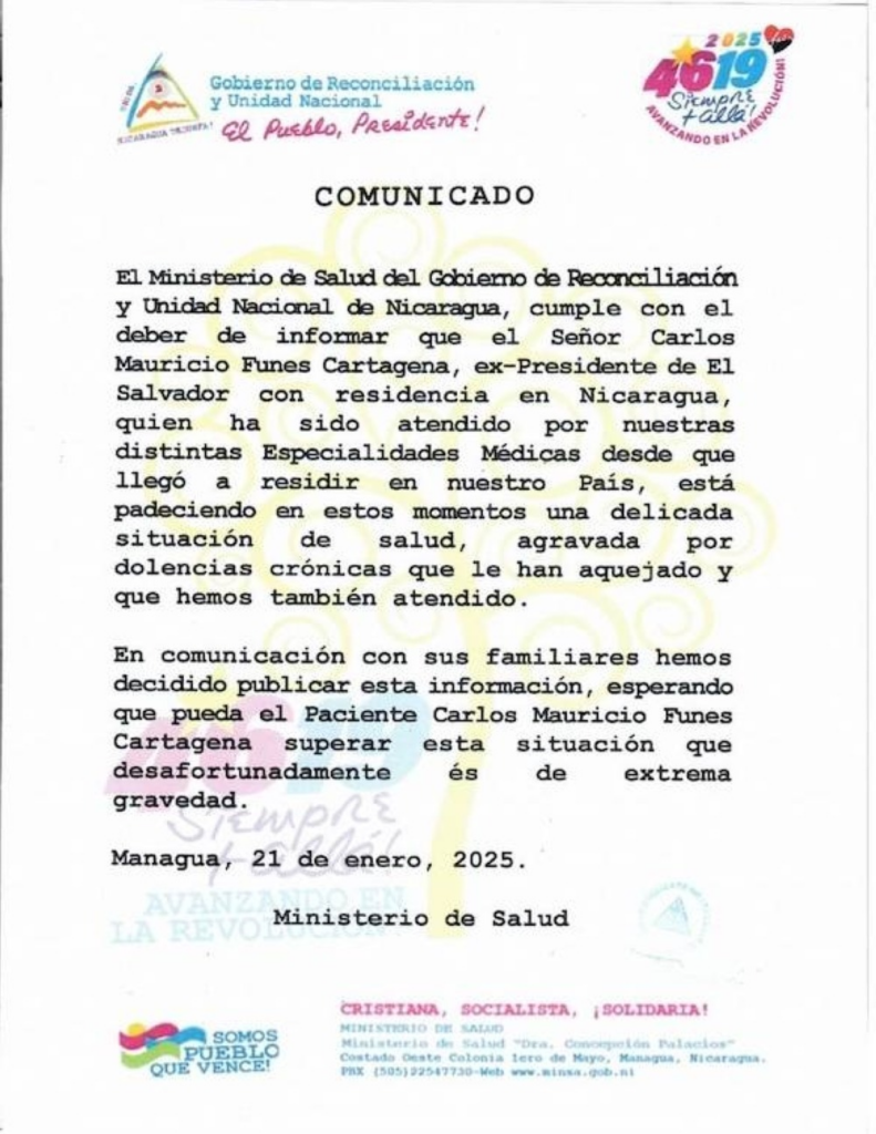 Sin embargo, el escueto documento publicado por el régimen de Daniel Ortega no brinda más detalles de la condición médica del prófugo Mauricio Funes.