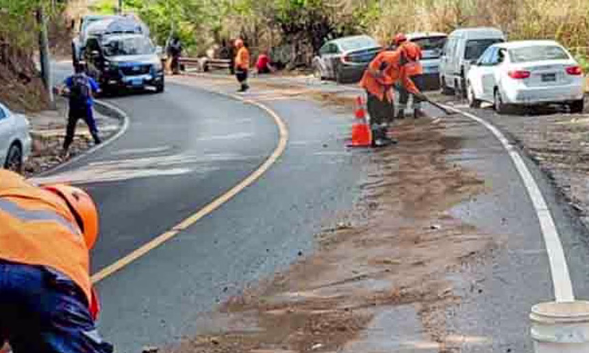 Personal de Protección Civil llevó a cabo este lunes trabajos de limpieza luego de reportarse un derrame de aceite en una vía de San Salvador.
