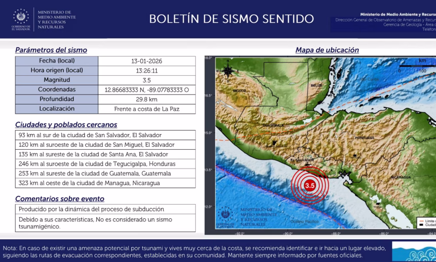 Según el reporte oficial, el movimiento telúrico tuvo su epicentro frente a la costa del departamento de La Paz, a unos 51 kilómetros al suroeste del Estero de Jaltepeque. El temblor fue registrado a la 1:26 de la tarde y presentó una profundidad aproximada de 30 kilómetros.