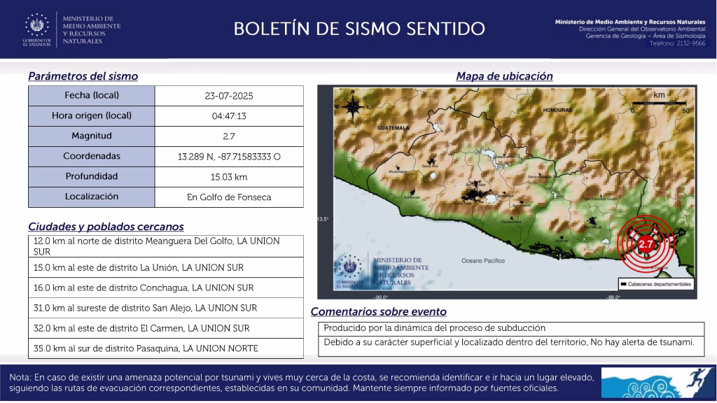 El epicentro fue en el golfo de Fonseca, a 12 kilómetros (km) al norte de Meanguera del Golfo.