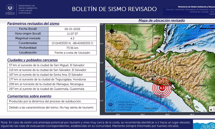 El Observatorio de Riesgos y Amenazas detalló que el sismo tuvo una magnitud de 4.3, con epicentro ubicado a 18 kilómetros al sur de la Bahía de Jiquilisco, y una profundidad aproximada de 73 kilómetros.