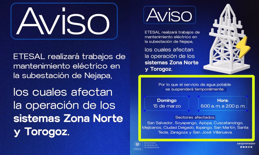La Administración Nacional de Acueductos y Alcantarillados (ANDA) informó que el servicio de agua potable será suspendido de forma temporal este domingo 15 de marzo, debido a trabajos de mantenimiento eléctrico programados.