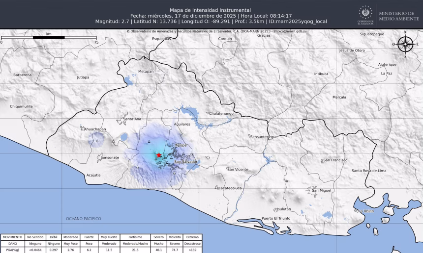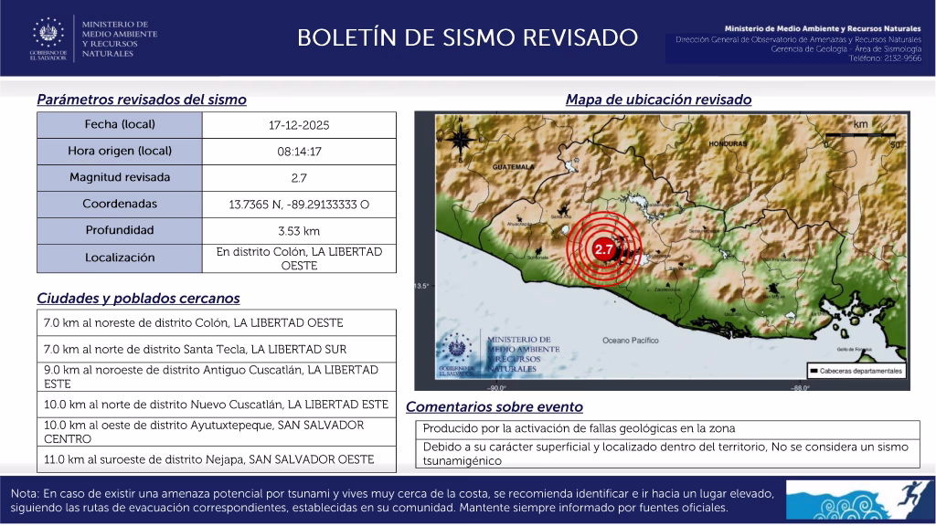 De acuerdo con los datos oficiales, el movimiento telúrico alcanzó una magnitud de 2.7 en la escala de Richter y tuvo su epicentro en el distrito de Colón, departamento de La Libertad.
