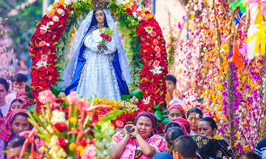 Esta tradición, conocida oficialmente como la Cofradía de las Flores y Palmas, tiene lugar cada primer domingo de mayo en Panchimalco. La festividad destaca por su vibrante muestra de devoción y por ser un símbolo del sincretismo religioso que caracteriza a la cultura salvadoreña.