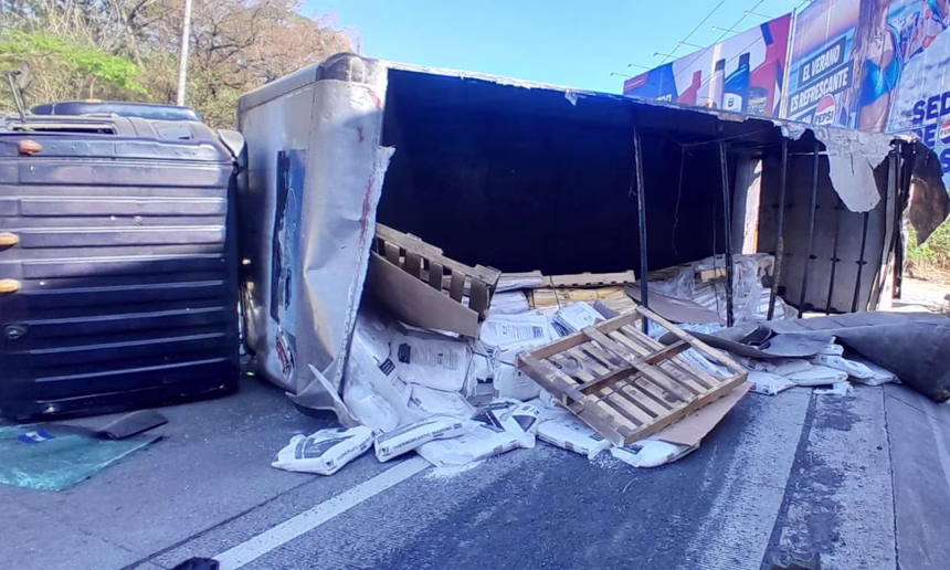 El Viceministerio de Transporte (VMT) reportó el vuelco de un camión de carga en la carretera hacia el Puerto de La Libertad, específicamente en el sector conocido como la curva del Papaturro.